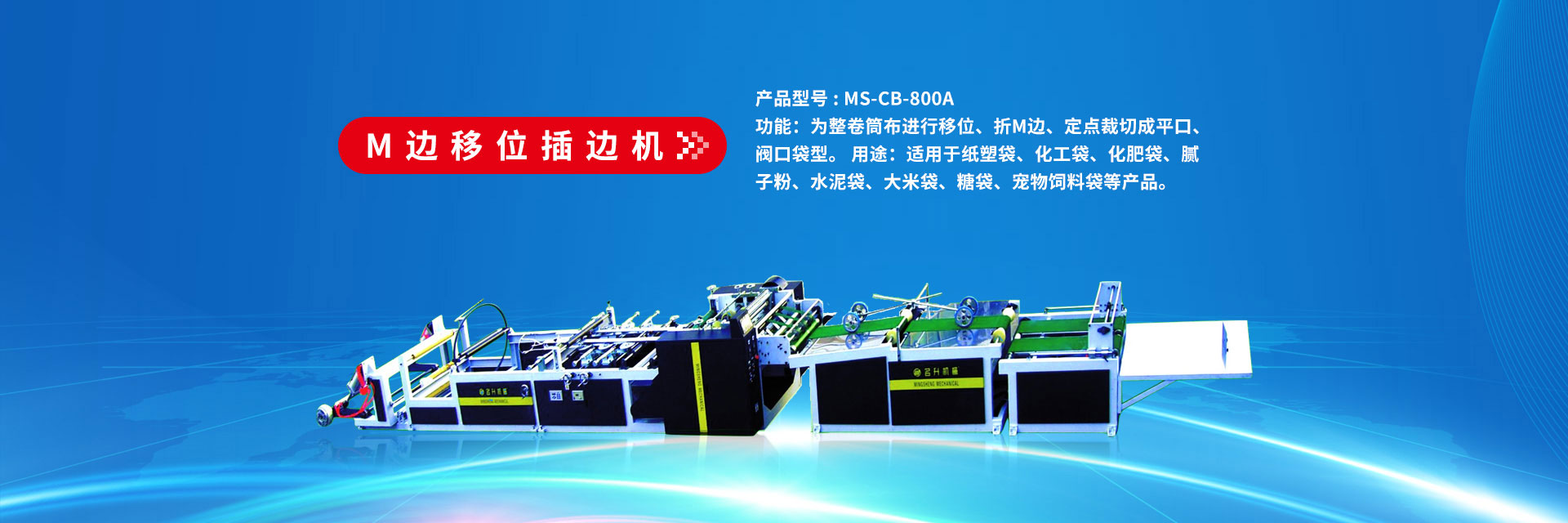 功能:為整卷筒布進行移位、折M邊、定點裁切成平口、閥口袋型。